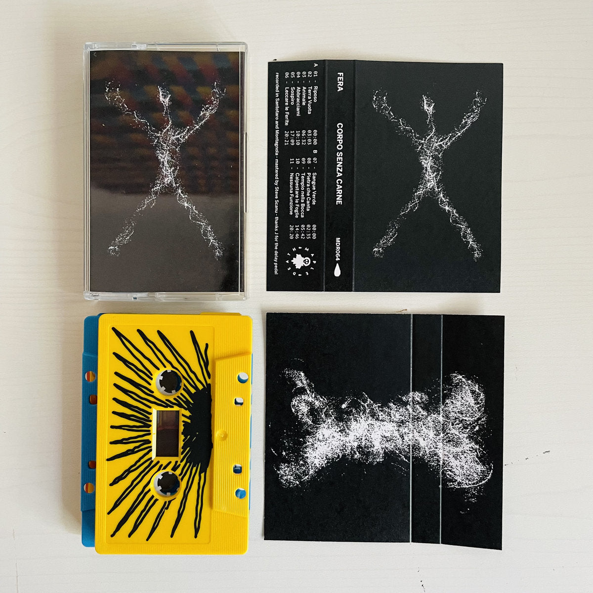 There is no body without flesh, no physical presence without its most obvious substance. In a continuous process of revealing what that substance is regarding to its own sound practice, FERA has produced this CORPO SENZA CARNE as a transient audio document about researching new and perhaps more intimate possibilities for a bare, naked, brutally honest and direct sonic expression. After STUPIDAMUTAFORMA’s recollection of ten years of research on melody and texture and after the desperate standstill of CATASTROFE ULTRAVIOLETTA’s broken industrial loops, CORPO SENZA CARNE strips FERA away of synthesizers and recognizable melody in a haze of echoes, broken pedals, distortions and sampling, sculpting a clearer, deeper path into sonic hypnosis and seduction. It is an invitation to lay bare, to listen closer and more carefully to impulses and voices outside of the human, to acceptance.